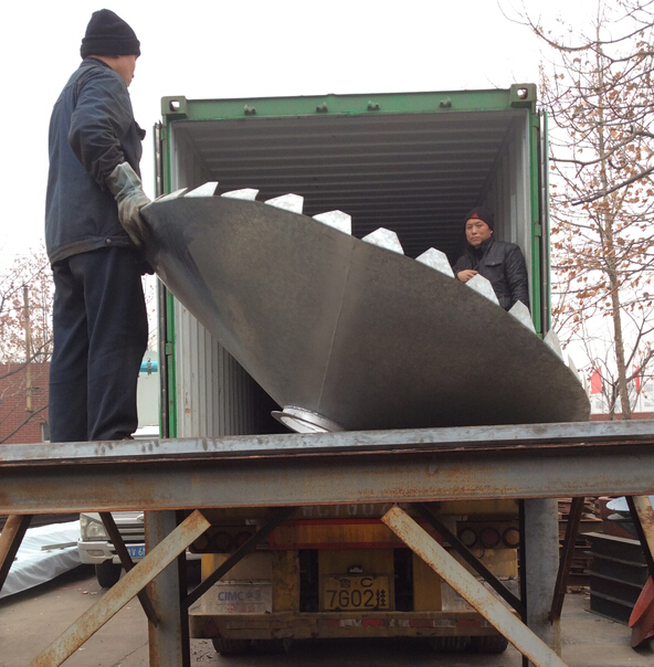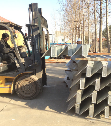 安裝時,根據倉徑的大小,采用多個吊裝架,吊裝架上固定一個手動葫蘆,使用特制的吊板用螺栓固定在倉壁墻板上,緩緩提升倉體。采取自上而下的安裝方式,即先安裝頂蓋、上層墻板,然后在裝中層墻板,再裝下層墻板,后將整個倉固定在基礎上。筒倉的構件全部采用高強度螺栓連接,安裝方便、迅速、可靠。