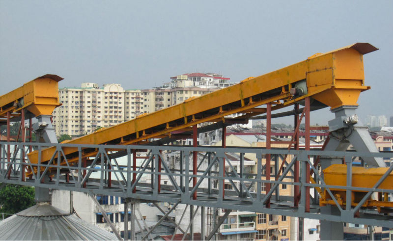TDSG角擋板膠帶輸送機的主要特點是可大傾角輸送,結構緊湊,占地面積少。輸送過程中,不易散落物料,有效提高了輸送功率。它是冶金、建筑、煤炭、化工、港口等領域理想的輸送設備。其結構是在平行橡膠兩側,增加不同角度的可彎曲、可伸縮的橡膠波形立式“裙擺”,帶體中間固定具有一定強度和彈性“T”型和“C”型橡膠隔膜板。將橡膠帶分隔成一個個匣形小區,使其既具有橡膠輸送帶過程中變向容易,又具有刮板輸送機和斗式提升機不易撒料的優點且能在較大傾斜角度范圍內輸送物料的特點。從而使大傾角擋邊輸送機輸送角度大可達90度。