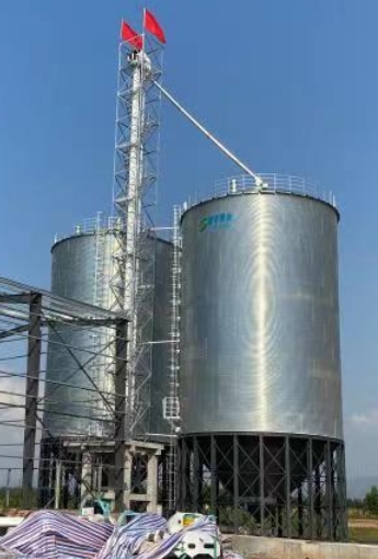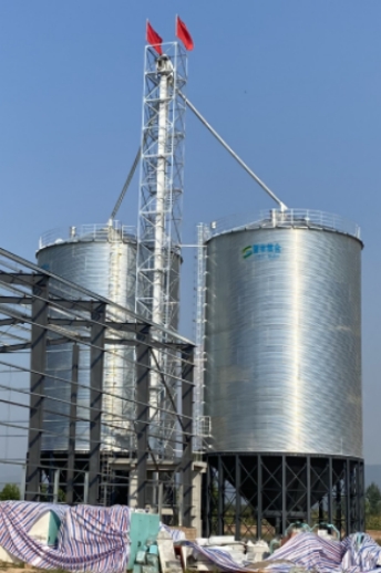 2臺1000噸存儲小麥/玉米的全鋼錐底鋼板倉一字排開,塔架設置在兩倉中心位置,提升機將糧食輸送到雙筒初清篩中,經(jīng)過初清篩將糧食中的大雜和小于分離出去,再經(jīng)提升機輸送到頂部配合電動三通,將糧食輸送到不同的鋼板倉中,倉內(nèi)設有通風和測溫裝置,可以實時檢測倉內(nèi)糧食溫度和濕度變化,達到安全儲糧的作用。當糧食出倉時,倉底刮板機,將糧食輸送到指定位置。