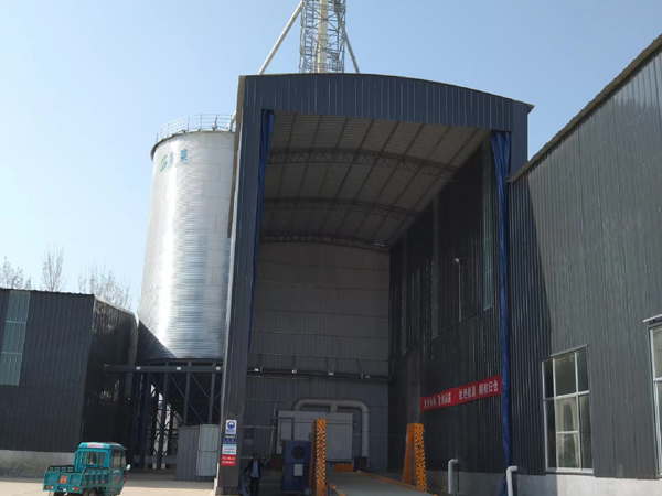 本項目鋼板倉由2臺1000噸鋼板倉組成,客戶為糧貿公司,存儲玉米,大豆等糧食使擁。2臺1000噸全鋼錐底鋼板倉并列排開,提升機位于兩個倉之間,將糧食提升上來以后,通過谷物溜管將糧食送進糧倉,節省了項目成本。