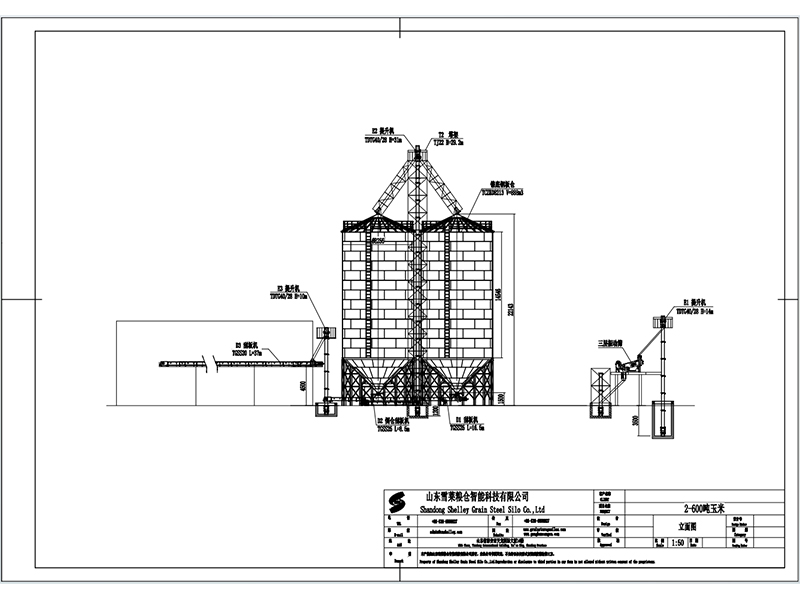 1.φ8.2m容積888m³鋼板倉兩座,可儲存玉米600噸以上,倉體采用270g/平方雙面鍍鋅板,機械輥壓一體成型,筒倉層數共計13層,每層高度1.12m,全鋼錐底結構,錐底角度按照45°標準設計,出料干凈。柱腿采用18根國標H型鋼,柱腿間拉筋。 2.50/28型號提升機三臺,輸送產量每小時可達50-60噸,斗提機帶有機玻璃觀察窗、鼠籠式尾輪,皮帶防跑偏打滑,三臺提升機同時配備止逆裝置、機身裝有防爆窗,有效保證使用安全,筒體表面鍍鋅處理,減少后期使用維護成本。 3.TGSS25型刮板機,輸送產量匹配50/28型號提升機,采用鎮江三維高分子聚乙烯耐磨刮板、錳鋼鏈條,機頭機尾加裝耐磨板,人字形防雨蓋板設計、機身鍍鋅處理,后期免維護。